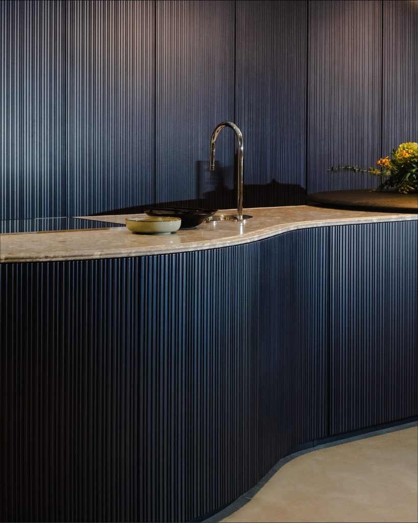 Une cuisine au meuble arrondi. Tangram se constitue ainsi de cinq éléments courbés qui peuvent être reliés à souhait à des modules dotés d’une façade droite. Il est ainsi possible de créer des ilots de cuisine arborant ces géométries inhabituelles, des compositions adossées aux murs ou même des solutions qui épousent parfaitement les coins. Pour accentuer la fluidité de Tangram la façade possède un détail décoratif particulier, réalisable sur demande: la finition tridimensionnelle Groove, laquelle présente une séquence de fraisages verticaux qui créent un motif au rythme irrégulier.